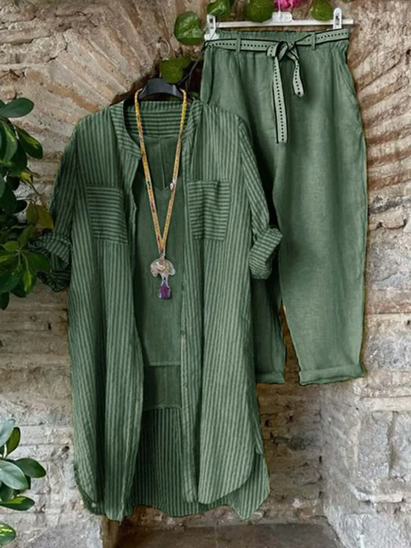 Striped shirt cotton linen pants two-piece set 01