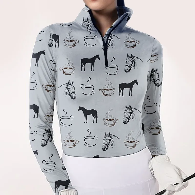 Women's Riding Style Horse&Coffee Print Long Sleeve Casual Shirt 3161
